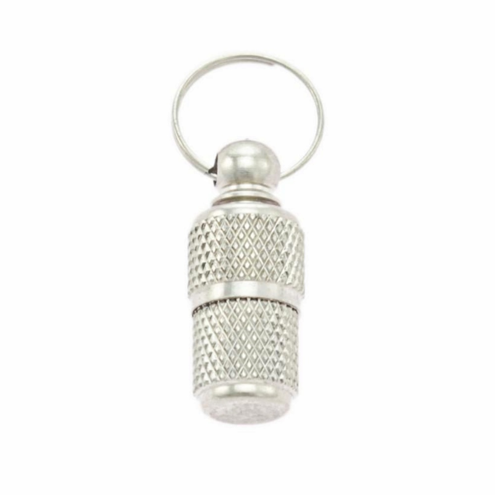 Kovový adresář na obojek ve tvaru soudku pro vložení adresy.