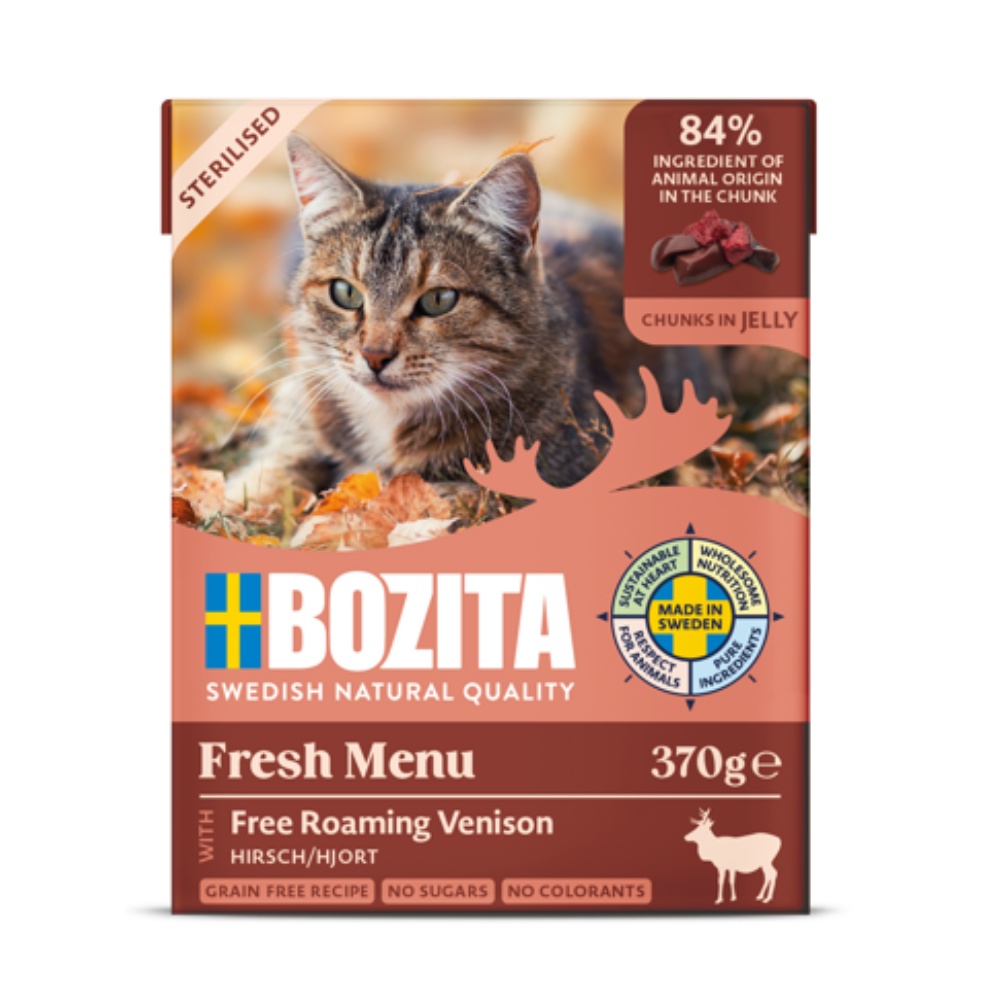 Bozita Cat Sterilised chutné kompletní mokré krmivo přizpůsobené pro sterilizované kočky. Připravené z vysoce kvalitních surovin a 84 % složek živočišného původu v kouscích.