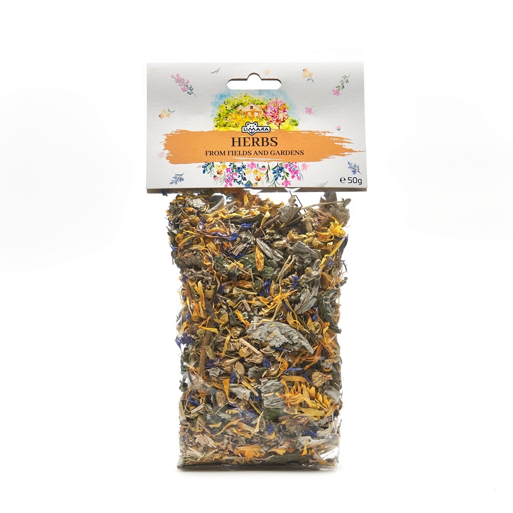 Bylinná směs pro králíky a drobné hlodavce obsahující bylinky z prostředí polí a zahrad, které jsou přirozenou součástí jídelníčku volně žijících druhů.