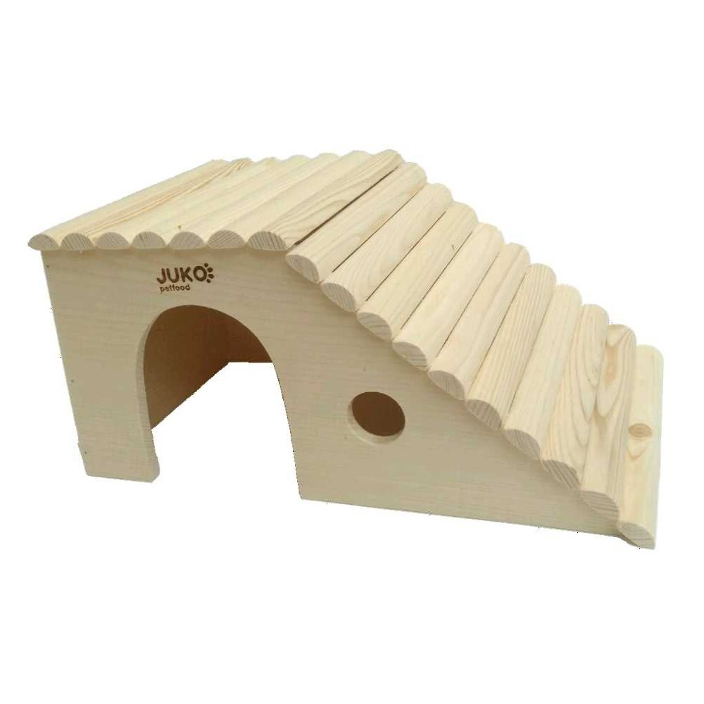 Domek s šikmým bokem, po kterém se zvířátko snadno dostane na plochou střechu. Využívat může tedy i střechu.