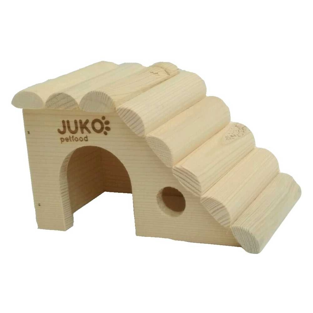 Domek s šikmým bokem, po kterém se zvířátko snadno dostane na plochou střechu. Využívat může tedy i střechu.