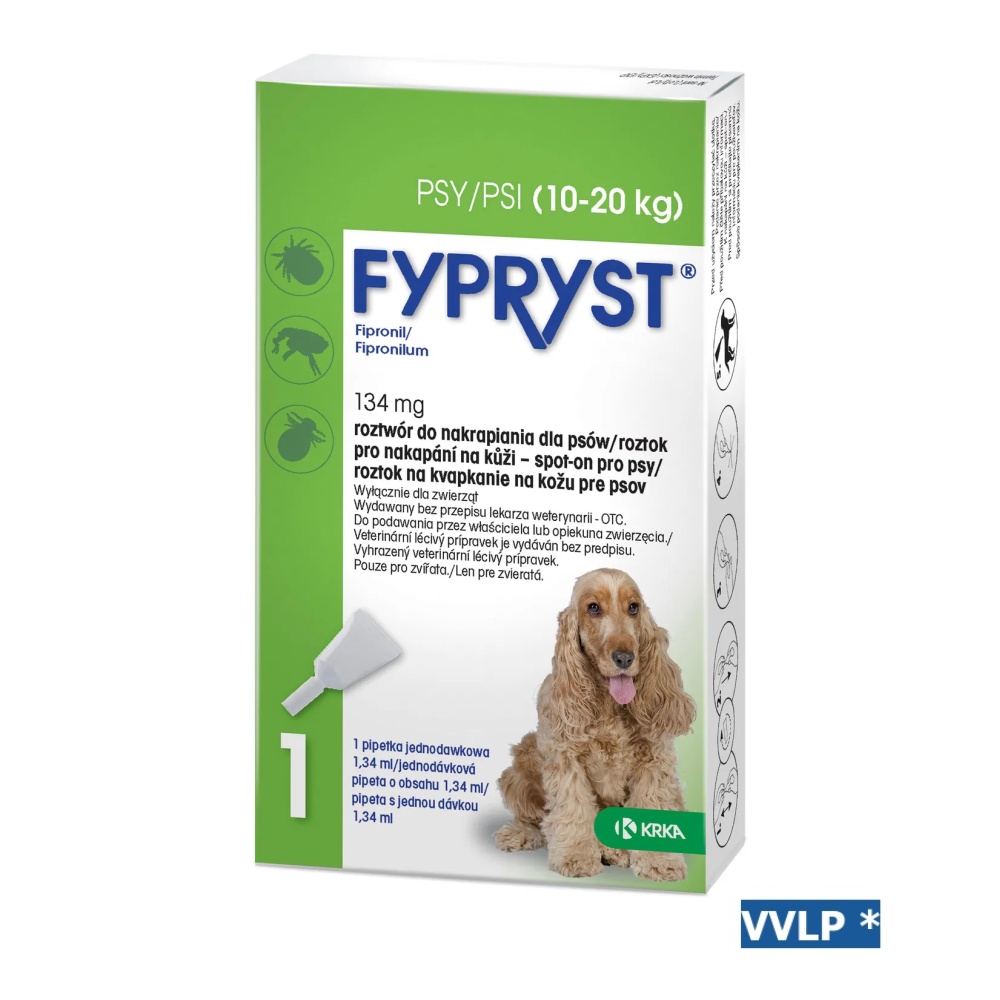 Dávkování a způsob podání: Dávkování Fypryst 134 mg spot-on pro psy - Jedna jednodávková pipeta o obsahu 1,34 ml roztoku pro nakapání na kůži - spot-on pro psa vážícího od 10 kg až do 20 kg živé hmotnosti. Takto zajistíte minimální doporučenou dávku fipronilu 6,7 mg / kg. Vzhledem k absenci studií týkajících se bezpečnosti přípravku je minimální léčebný interval 4 týdny. Měsíční léčba se doporučuje v případě vysokého rizika opakovaného napadení blechami, pokud je pes alergický na bleší kousnutí, v případě nutnosti kontroly napadení klíšťaty nebo při častém koupání psa za použití hypoalergenních nebo zvláčňujících šamponů. V oblastech, kde nehrozí vážné napadení blechami a klíšťaty, může být přípravek Fypryst spot-on aplikován každé dva až tři měsíce.