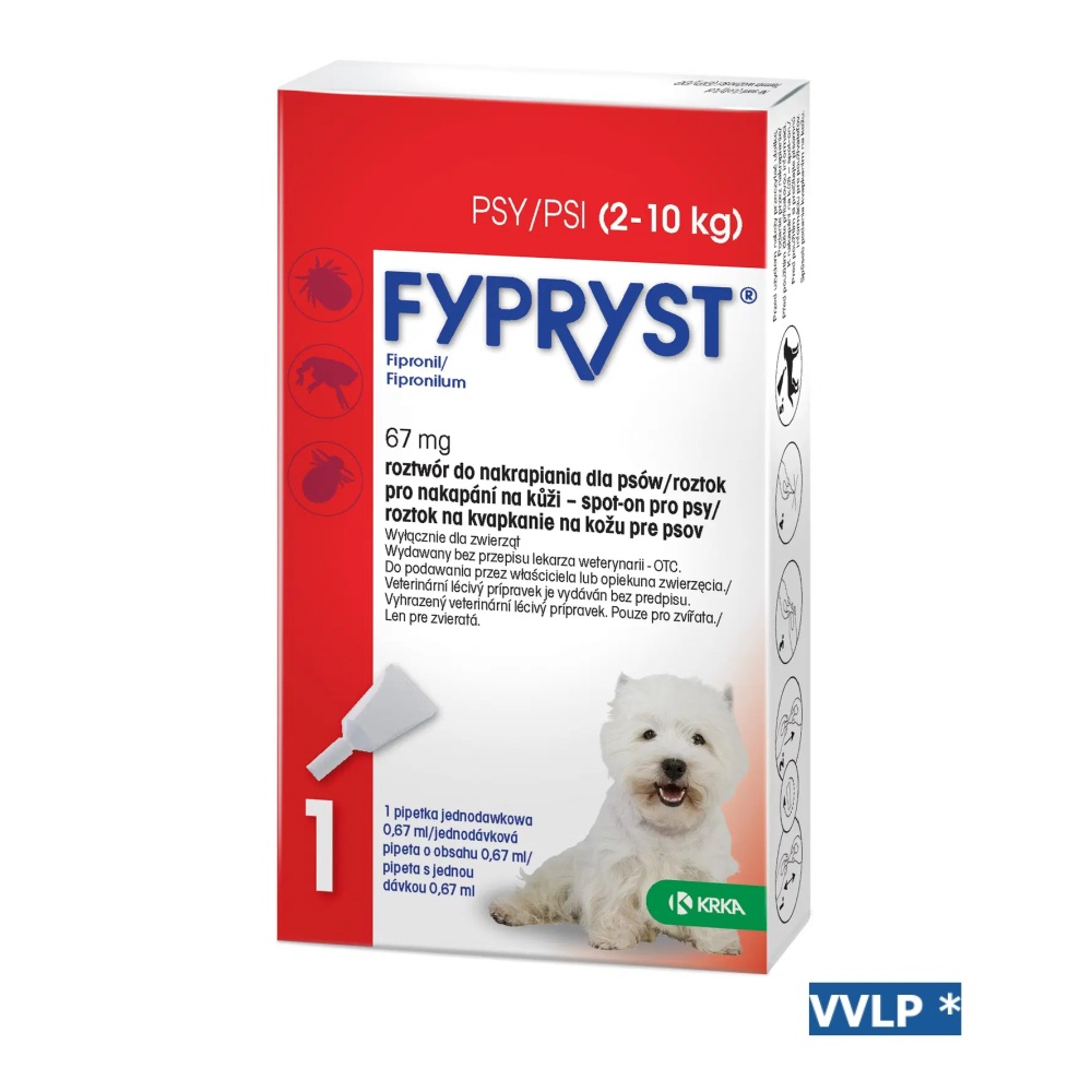 Dávkování a způsob podání: Dávkování Fypryst 67 mg spot-on pro psy - Jedna jednodávková pipeta o obsahu 0,67 ml roztoku pro nakapání na kůži - spot-on pro psa vážícího od 2 kg až do 10 kg živé hmotnosti. Takto zajistíte minimální doporučenou dávku fipronilu 6,7 mg / kg. Vzhledem k absenci studií týkajících se bezpečnosti přípravku je minimální léčebný interval 4 týdny. Měsíční léčba se doporučuje v případě vysokého rizika opakovaného napadení blechami, pokud je pes alergický na bleší kousnutí, v případě nutnosti kontroly napadení klíšťaty nebo při častém koupání psa za použití hypoalergenních nebo zvláčňujících šamponů. V oblastech, kde nehrozí vážné napadení blechami a klíšťaty, může být přípravek Fypryst spot-on aplikován každé dva až tři měsíce.