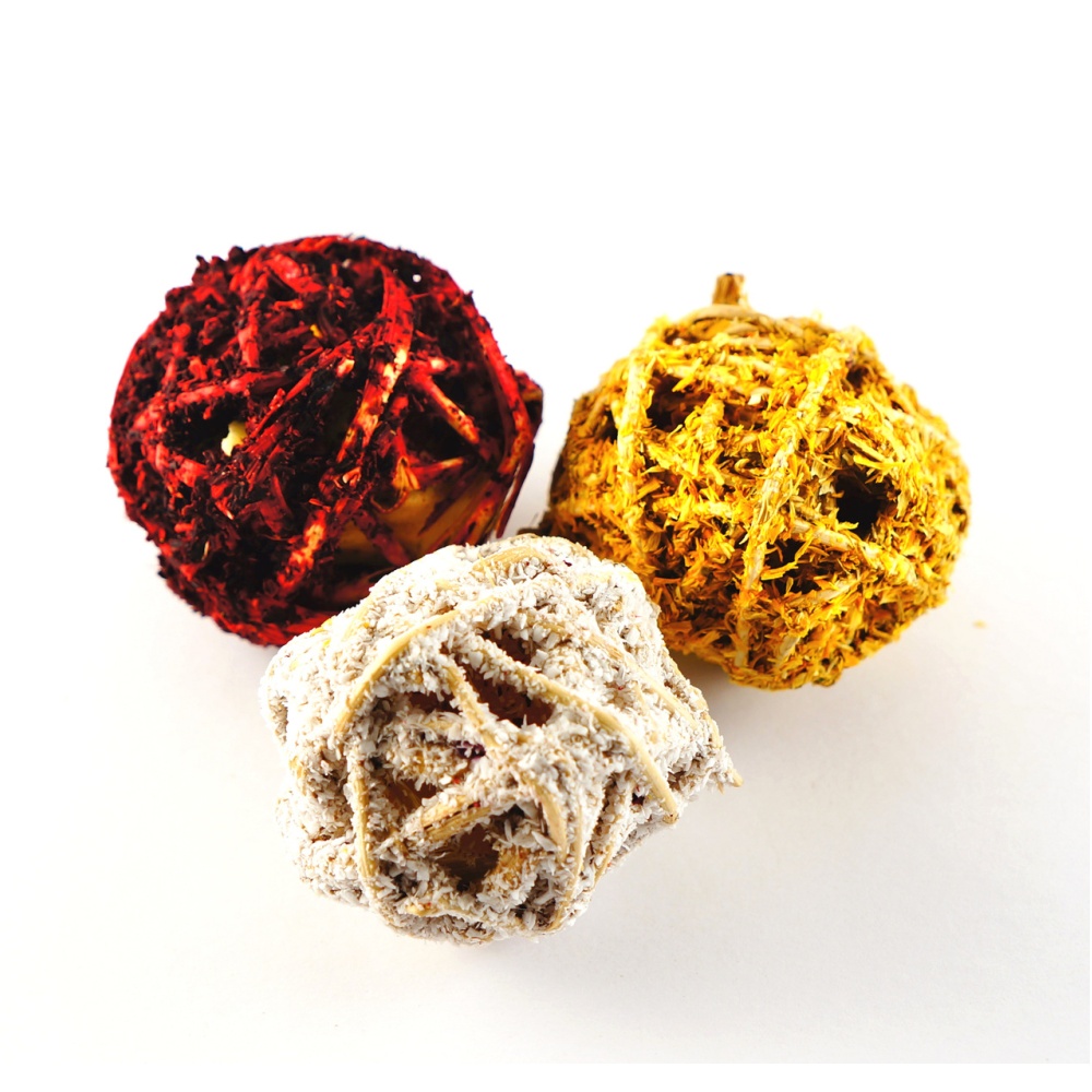 Ratanové bylinkové kuličky plněné ovocem pro hlodavce.