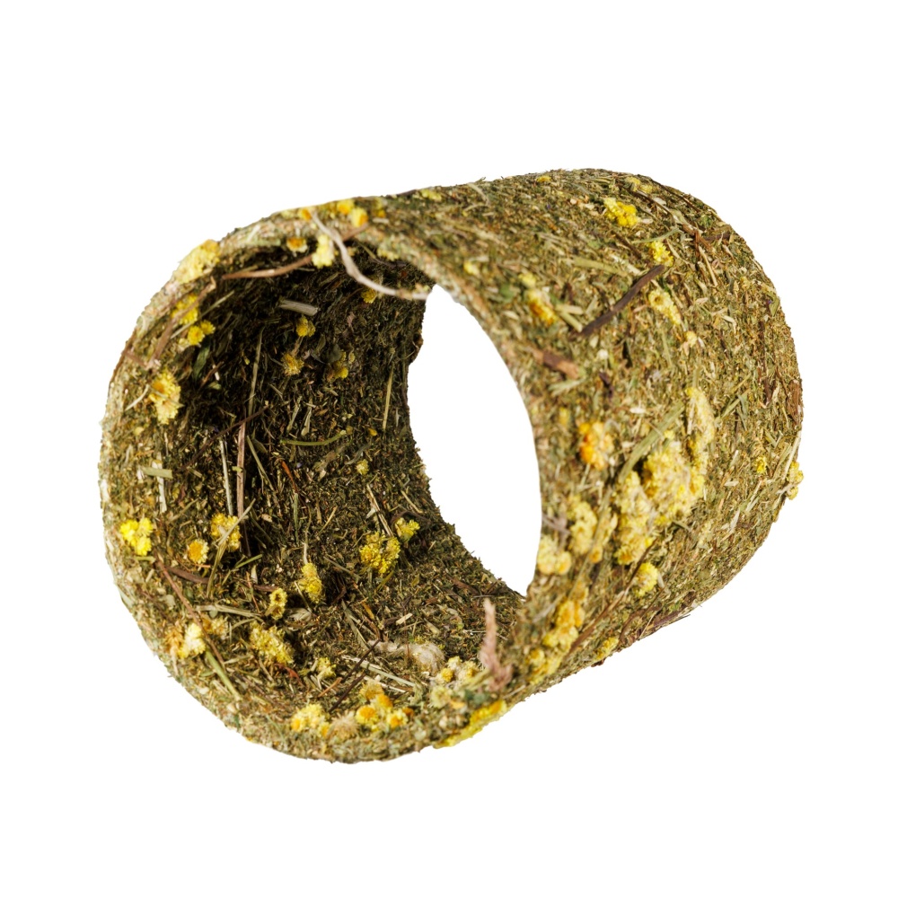 Bylinková přírodní pochoutka pro hlodavce ve tvaru tunelu na roli se slaměnkou a mátou.