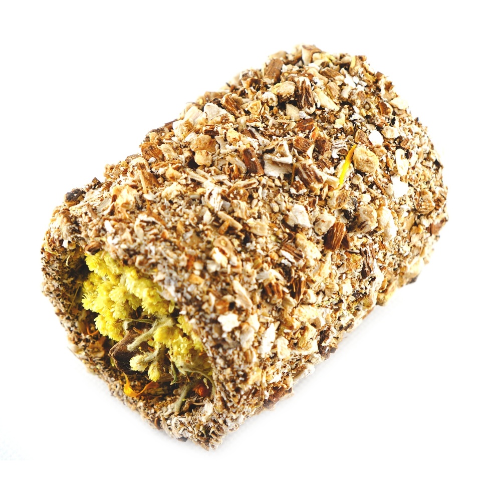 Bylinková bezobilná přírodní pochoutka pro hlodavce ve tvaru tunelu na roli s kořenem pampelišky, topinamburem a slaměnkou.