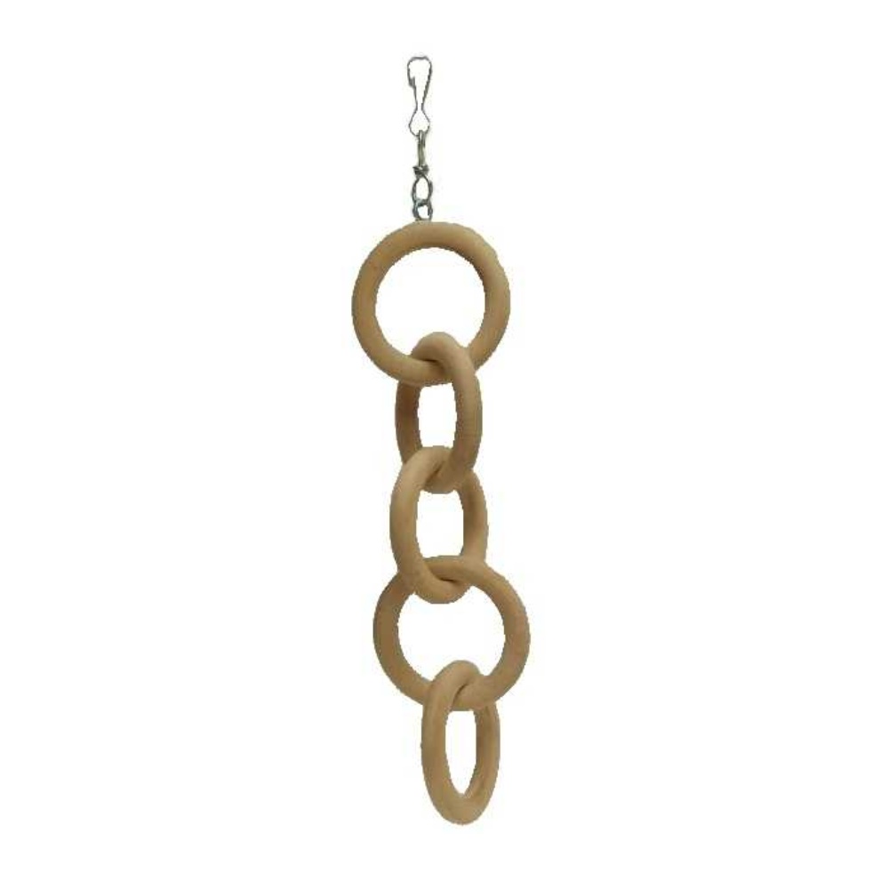 Dřevěné kruhy spojené do řetězu. Síla dřeva je cca 1cm, vnější průměr cca 8cm, hračka vhodná pro střední a velké papoušky, určena k šplhání, zavěšení pomocí karabiny. Díky obrtlíku se přišroubované očko nevytáhne ani když bude papoušek s kruhy točit.