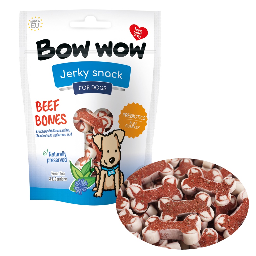 Pochoutka pro psy ve tvaru hovězích kostiček plné masa.