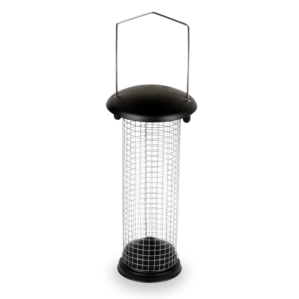 Krmný zásobník z kovu pro malé divoké ptactvo na oříšky.