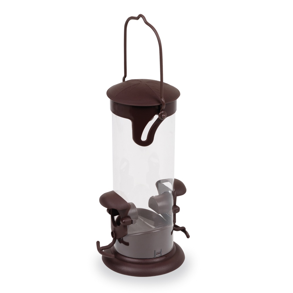 Závěsné plastové venkovní krmítko se zásobníkem pro ptactvo.