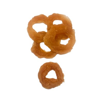 Masový pamlsek pro psy z kuřecího masa ve tvaru kroužku. Pamlsek je měkký a lze ho nastříhat i pro menší pejsky.