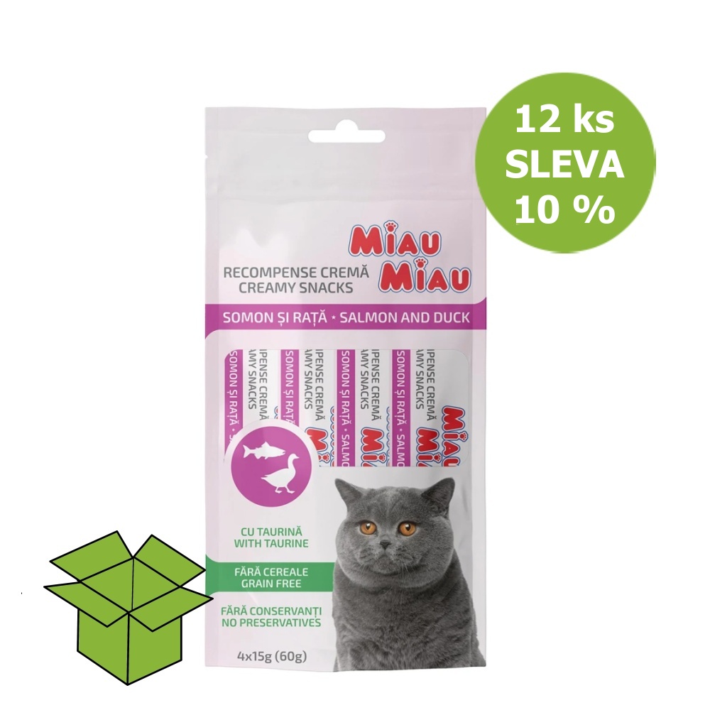 Miau Miau Creamy Snacks Cat losos a kachní 15 g 4 pack (12 ks) SLEVA 10 %