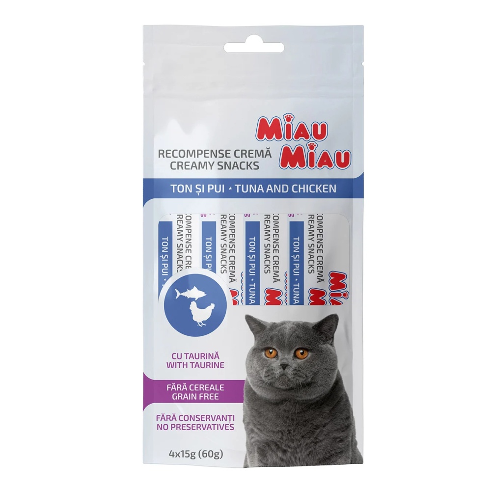 MIAU MIAU smetanová svačinka pro kočky s tuňákem a kuřecím masem.