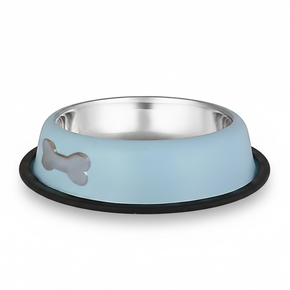 Nerezová miska, která zaujme také svým vzhledem. Vnější stranu ve světle modré barvě doplňuje znak kosti. Spodní okraj je opatřen gumou, miska neklouže po podlaze.