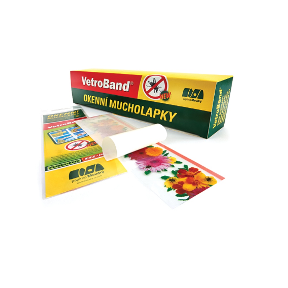 Mucholapka Vetroband má na zadní straně červený lepový pásek, který slouží k uchycení lapače na sklo okna. Lapač je účinný na všechny druhy hmyzu, které létají po okně.