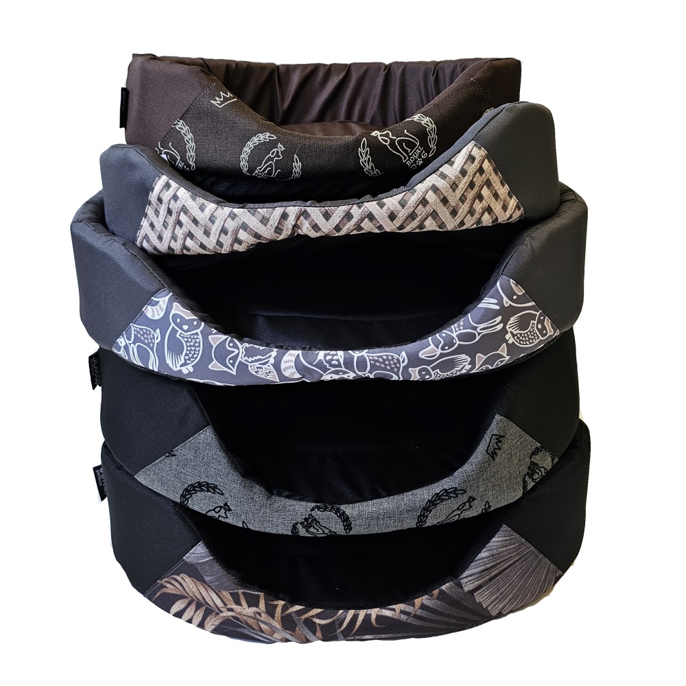 Látkový pelíšek pro psy ve tvaru oválu s vyjímatelnou podložkou.