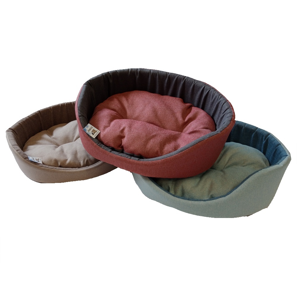 Látkový pelíšek pro psy ve tvaru oválu s vyjímatelným polštářkem.