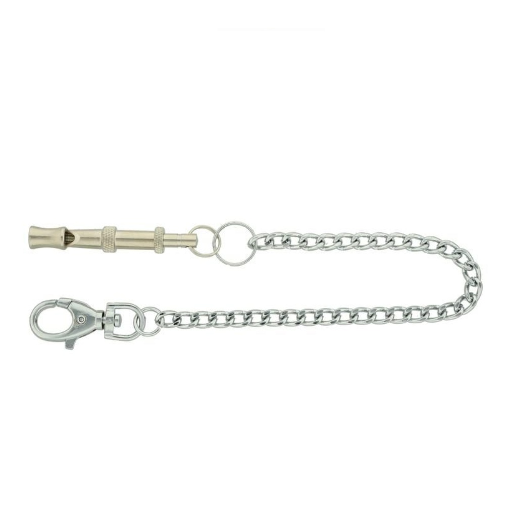Díky nastavitelnému šroubovému mechanismu si můžete upravit výšku tónu podle potřeby. Součástí je kovový řetízek s karabinkou, který umožňuje snadné připnutí na oděv, klíče nebo vodítko – budete ji mít vždy po ruce.