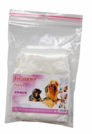 Pro jednorázové použití. Plena má dobře držící opakovaně použitelné upínací pásky které jsou upravovány tak aby se nezachytávala srst zvířete k lepící části upínacího pásku. Možné použít přes den i na noc.