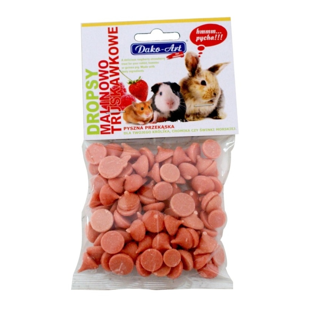 Chutná svačinka doplňující každodenní stravu hlodavců ve tvaru dropsů s malinovo-jahodovou příchutí.