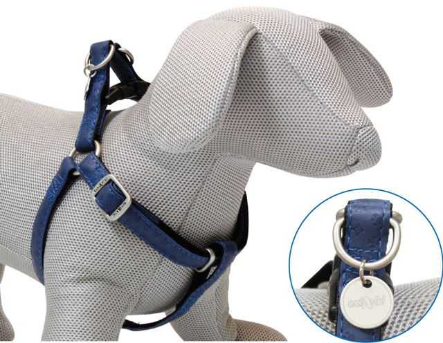 Kožený postroj modré barvy s celopotiskem, podšitý jemným nylonem ve stejné barvě.
