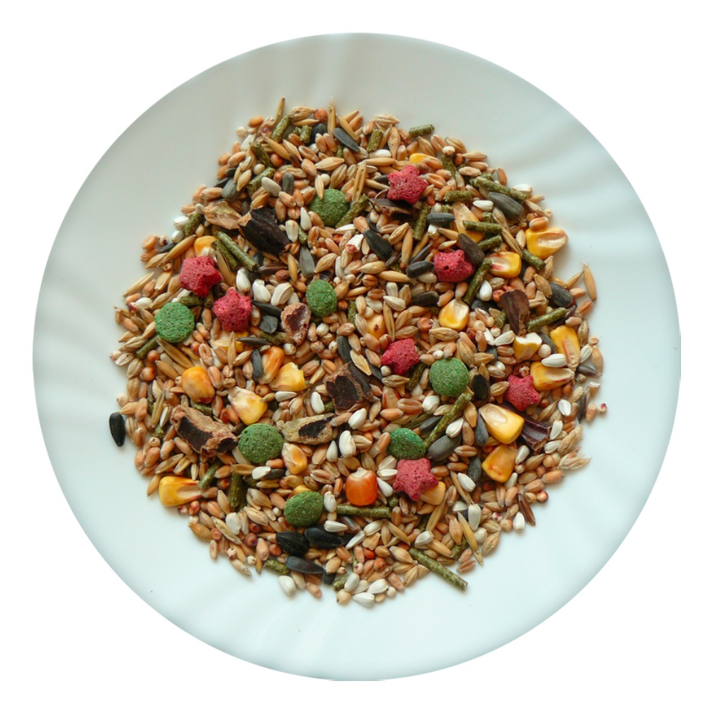 Složení: Pšenice, ječmen, kukuřice, čirok, extrudované obiloviny, oves celý, hrachové vločky, pšeničné vločky, ječné vločky, svatojánský chléb, slunečnice žíhaná, světlice barvířská, slunečnice černá.