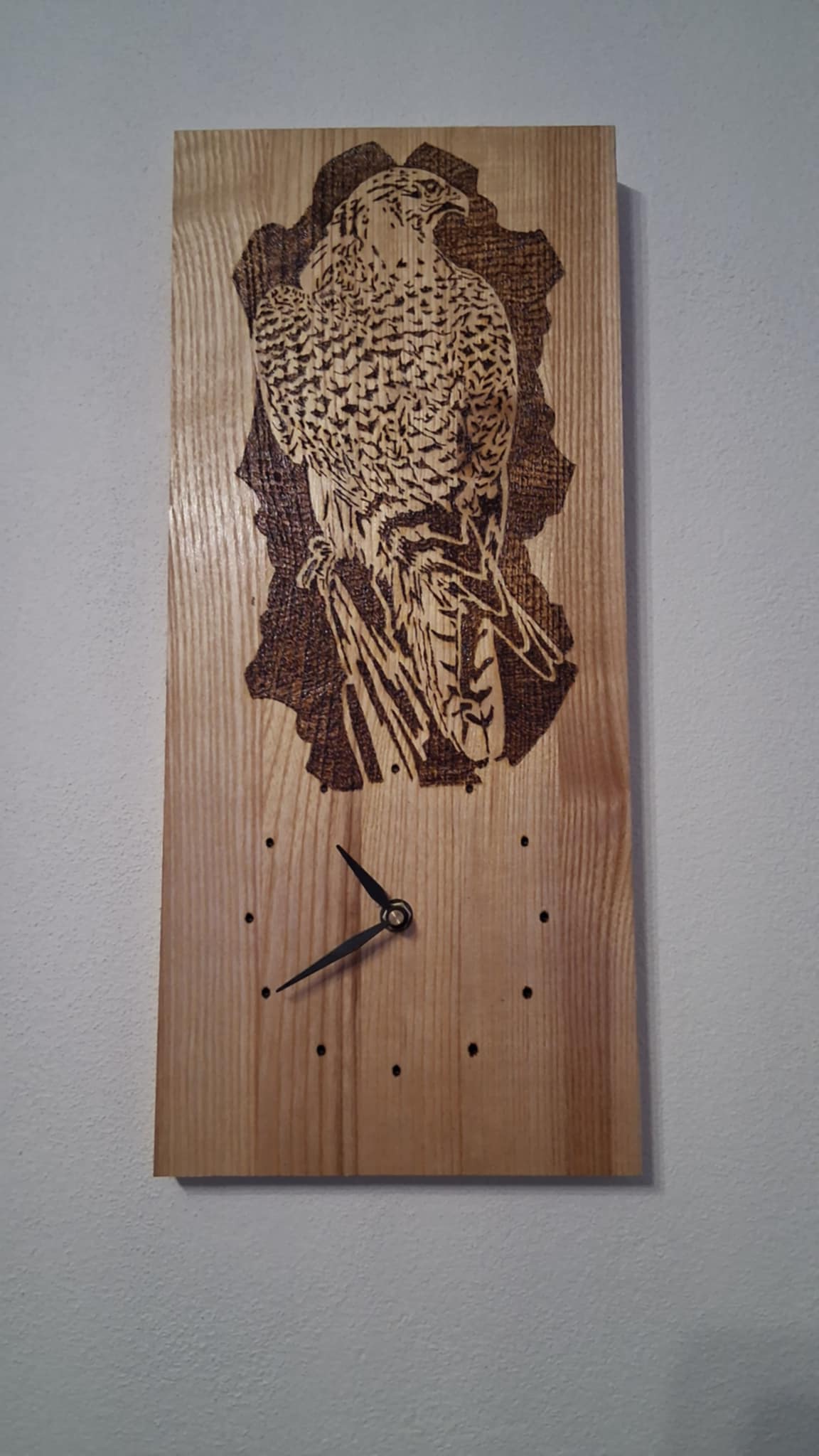 Originální nástěnné hodiny z masivního dřeva s ručně vypalovaným motivem sokola. Každý kus je jedinečná ruční práce vytvořená pyrografií, díky které vzniká detailní a trvanlivý obraz. Hodiny jsou plně funkční, tiché a ideální jako dekorace do bytu, kanceláře či na chatu.