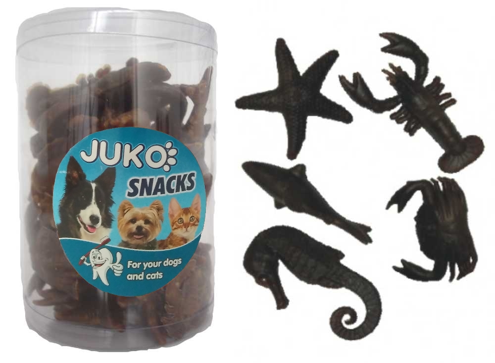 Pochoutka pro psy ve tvaru plodů moře s rybí příchutí.