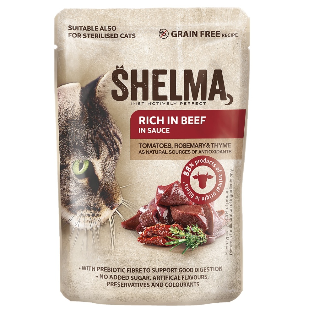 - SHELMA Cat hovězí s rajčaty a bylinkami v omáčce, kapsa 85 g- 28ks