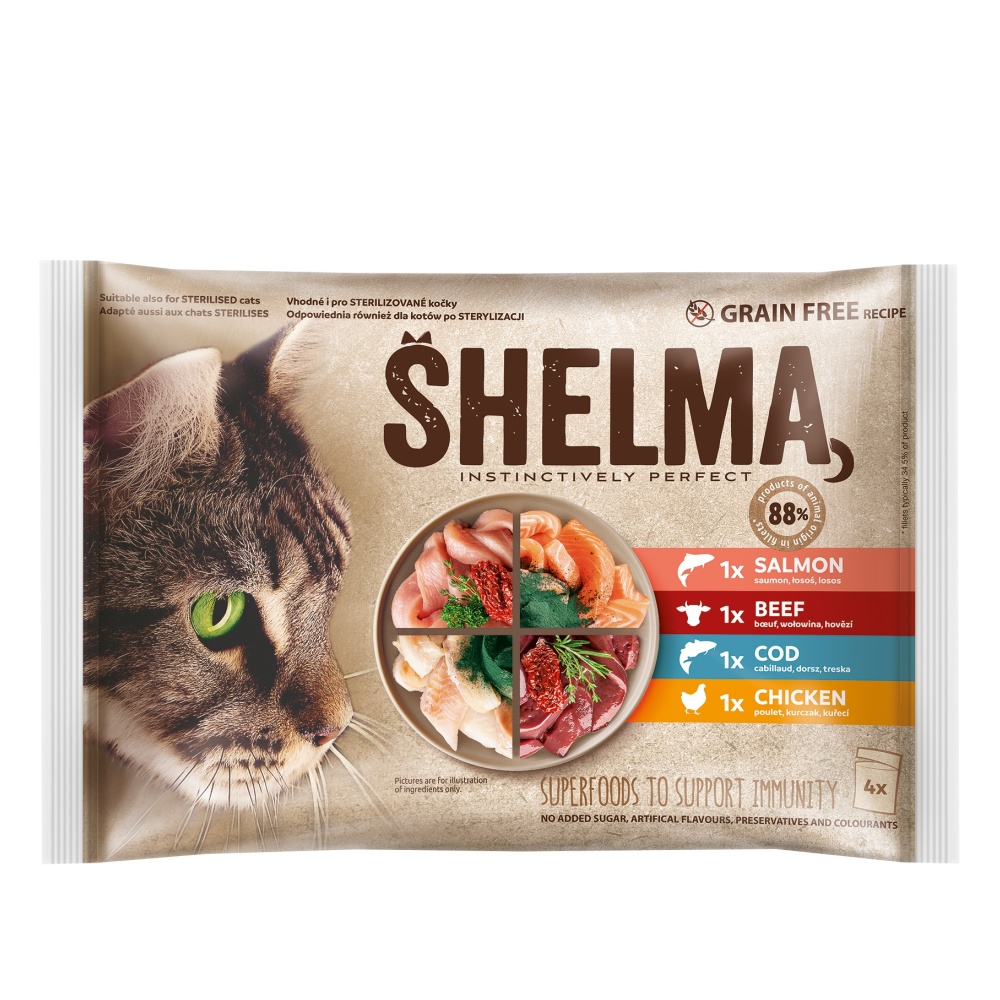 - SHELMA Cat kuře, hovězí, losos a treska, kapsa 85 g - 15balení po 4 kapsičkách