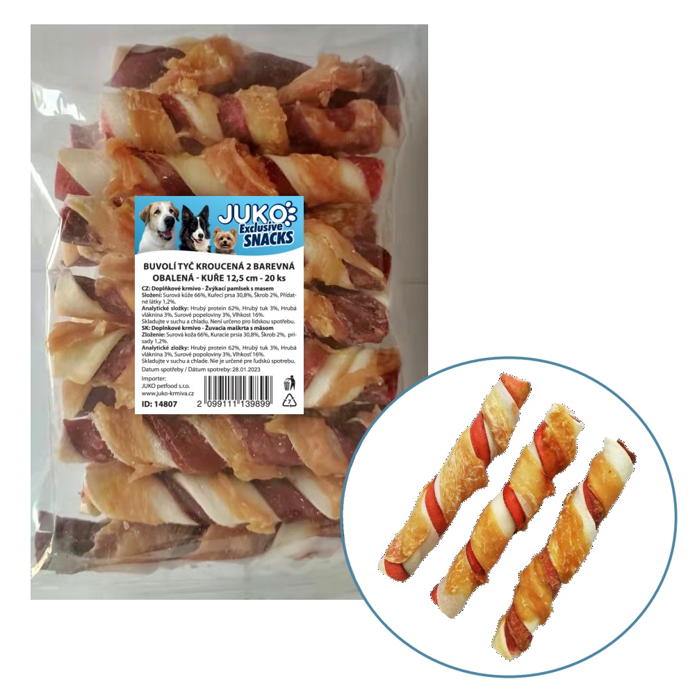 Tyč buvolí kroucená 2 barevná obalená kuřecím masem JUKO Snacks 12,5 cm (20 ks)