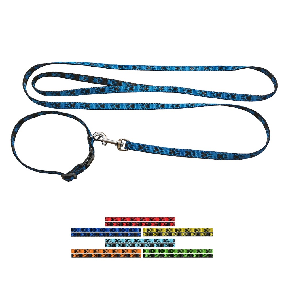 Komplet vodítka a obojku se vzorem. Připínání na karabinu. Obojek má plastovou sponu pro rychlou manipulaci, s pomocí posuvného mechanismu ho lze snadno přizpůsobit obvodu krku psa.